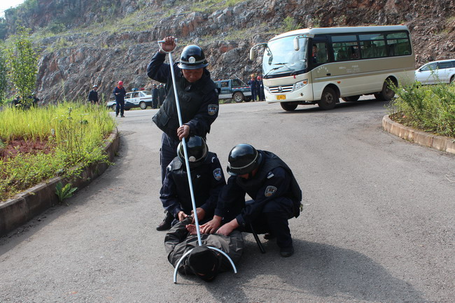 演練設(shè)置為早上9點30分左右,在通勤車乘坐點,一群身份不明的人員在職工乘坐通勤車下班時進(jìn)行突然襲擊,對車間設(shè)施進(jìn)行破壞,其中3名“暴恐分子”在中巴車內(nèi)挾持了3名職工,守護精選工段的保衛(wèi)人員接到報警后,兩名保衛(wèi)人員立即對恐怖分子進(jìn)行阻擊,另外一名保衛(wèi)人員立即把情況上報給反恐小組辦公室,反恐領(lǐng)導(dǎo)小組迅速啟動應(yīng)急方案。
