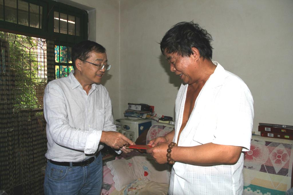 錫業(yè)股份黨委委員、工會主席李林走訪慰問老廠分公司困難職工李生保。(劉亞杰/攝)