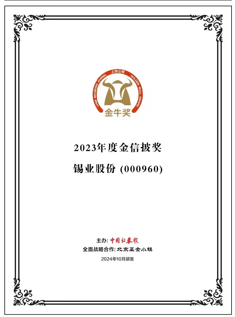 10月24日,中國(guó)證券報(bào)正式揭曉了2023年上市公司金牛獎(jiǎng)榜單,錫業(yè)股份(000960)榮獲“2023年度金信披獎(jiǎng)”。從評(píng)價(jià)結(jié)果統(tǒng)計(jì)來(lái)看,入圍參選樣本的4208家A股上市公司中僅有不超過(guò)450家獲獎(jiǎng),占入圍上市公司總數(shù)不到11%。“2023年度金信披獎(jiǎng)”評(píng)價(jià)重點(diǎn)考慮上市公司的信息披露質(zhì)量和效率。評(píng)選組委會(huì)根據(jù)上市公司年報(bào)質(zhì)量、審計(jì)情況、交易所信息披露考評(píng)等指標(biāo)進(jìn)行綜合判斷,并最終評(píng)選出在信息披露方面表現(xiàn)較為突出的上市公司。